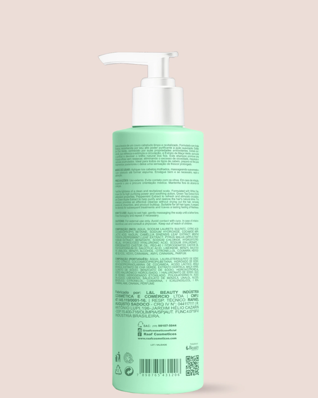 Formulado com Chá Verde, conhecido por suas propriedades antioxidantes; Extrato de Hortelã, que refresca e estimula a circulação; e Extrato de Maçã Verde, que ajuda a purificar e devolver o brilho natural dos fios, Argila Branca, purifica, remineraliza e suaviza, deixando fios mais saudáveis e com brilho natural.Este shampoo promove uma limpeza eficaz sem ressecar, eliminando o excesso de oleosidade, impurezas e resíduos acumulados.