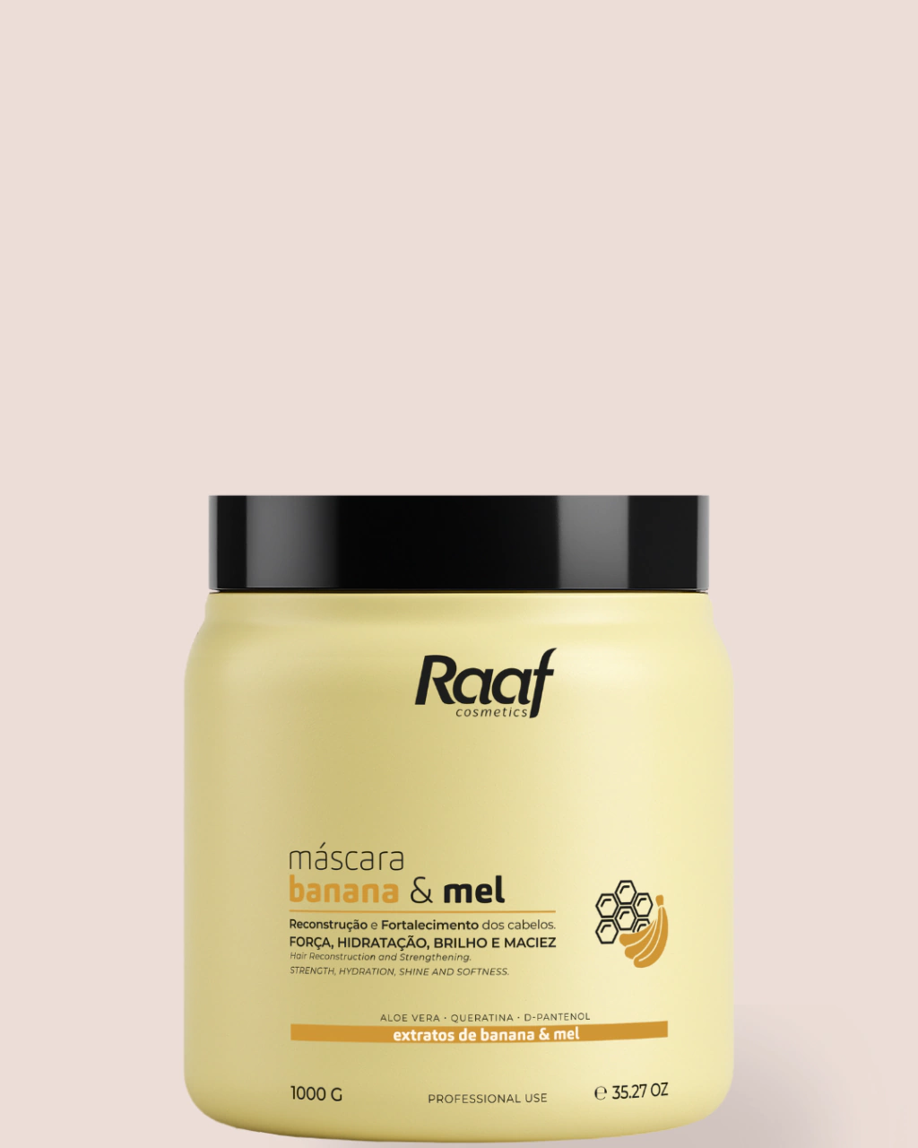 Raaf Cosmetics' Banana & Honey Hair Mask is a true intensive treatment for weakened and damaged hair. Its powerful formula combines banana extract, rich in essential vitamins and minerals for deep nourishment, with honey, which delivers intense hydration and brilliant shine. Enriched with keratin and D-panthenol, it strengthens the hair fiber, repairs damage, and restores elasticity, leaving hair healthier, stronger, and revitalized. Ideal for the reconstruction and strengthening phase of your hair care routine.